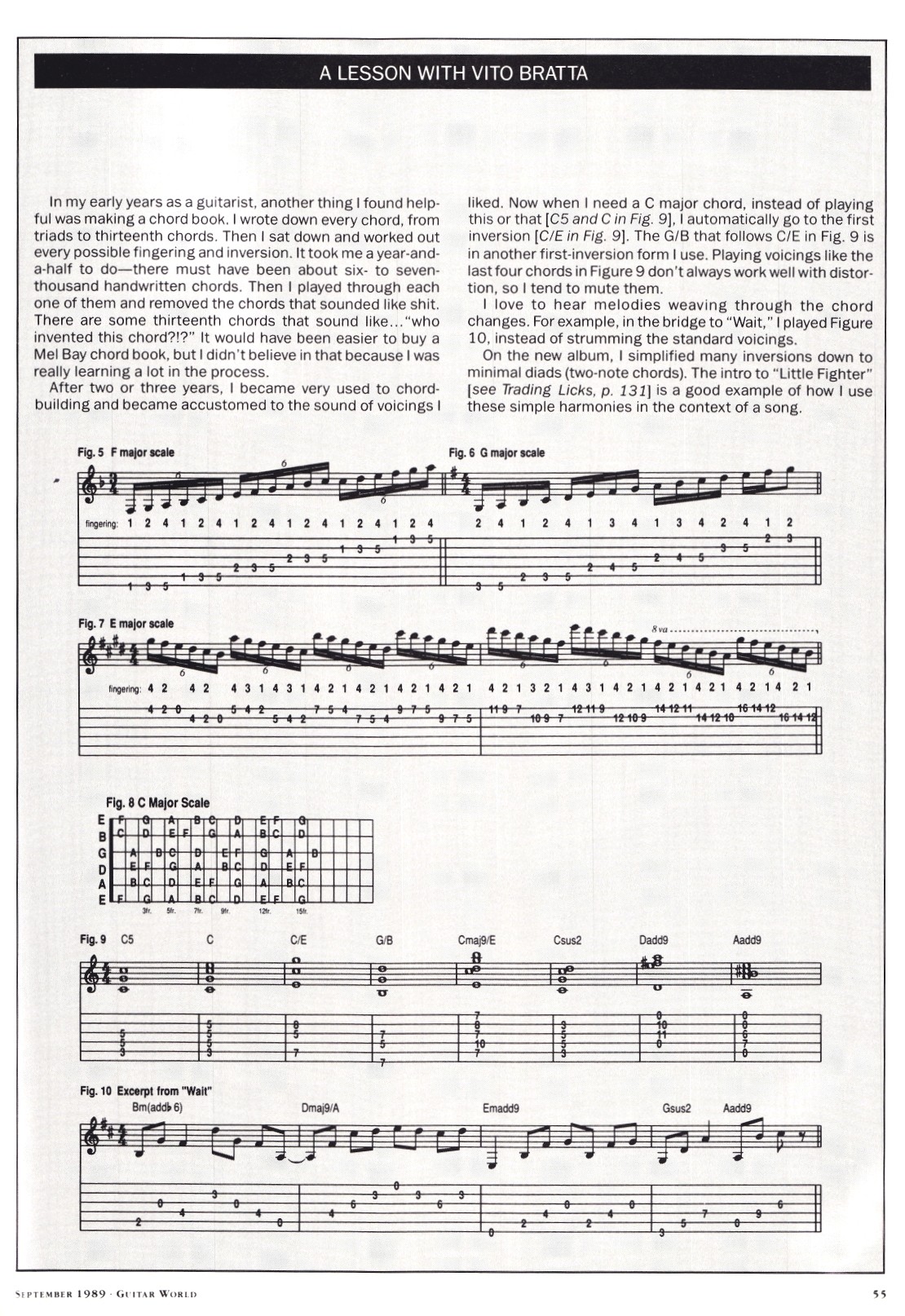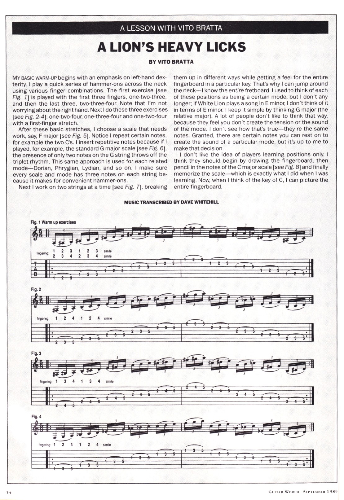 In the September 1989 issue of Guitar World, Vito Bratta, guitarist for White Lion, revealed some of his warm-up techniques and tips for developing fretboard knowledge and dexterity. You can check them out here, or download the pages as a PDF document.
